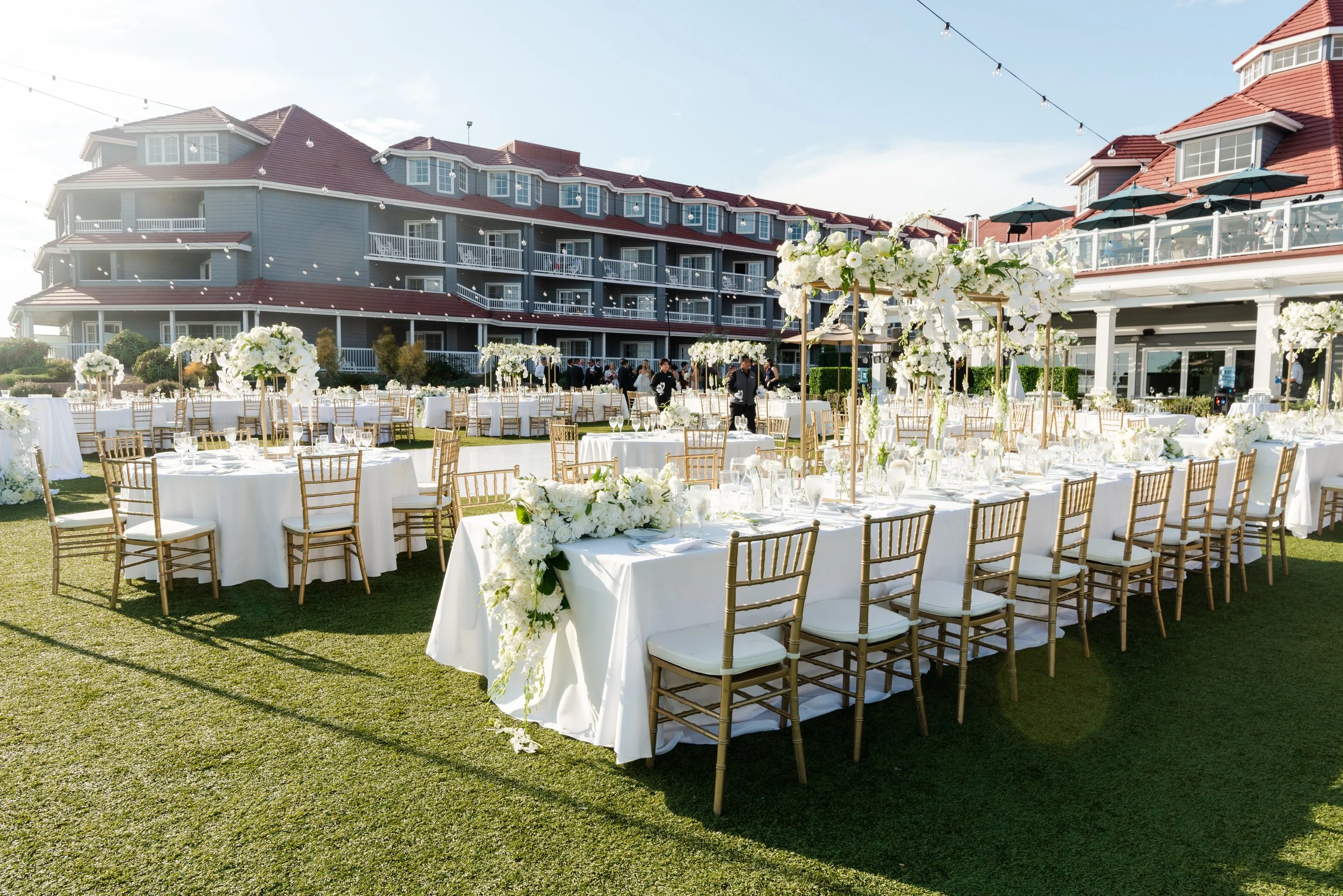 Following the ceremony, guests made their way to the Laguna Cliffs Marriott Resort & Spa, where the celebration continued with a relaxed yet refined cocktail hour. With sweeping views of the Pacific Ocean, guests sipped signature cocktails, enjoyed delicious hors d’oeuvres, and mingled on the lawn while taking in the coastal breeze—an effortless transition into the evening’s festivities.